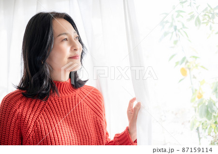 逆光の明るい部屋でカーテンをあけ朝日を見て微笑む美しい日本人(アジア人)女性 コピースペースあり