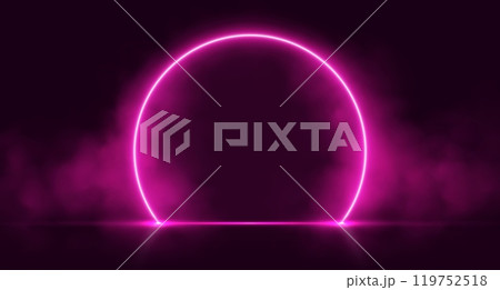 Neon arch with smoke, pink glowing portal, futuristic circle gate, magic stage with vapor.