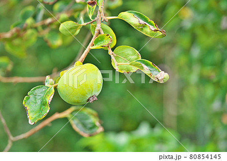 まだ未熟な緑色のカキの実