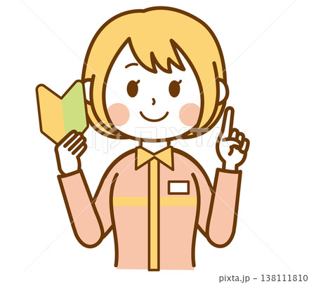 初心者マークを持っているコンビニの制服を着た女性店員のイラスト