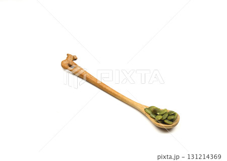 Pile lentil in wooden spoon isolated on wooden background. Top view.