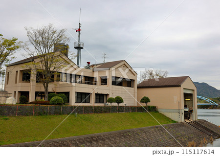 千丈寺湖をわたる青い橋 末吉橋とボート格納庫