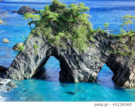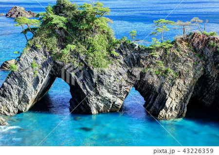「岩手県」青い海と穴通磯の風景