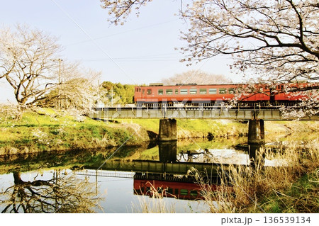 桜咲く春の岩徳線を走るレトロなディーゼル列車