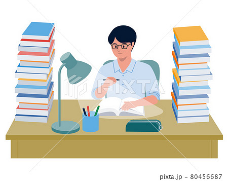 本に埋もれた机に向かって勉強する男性のベクターイラスト