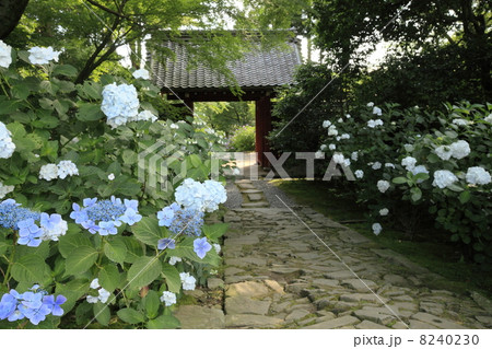 山門へと続く石畳と紫陽花