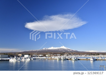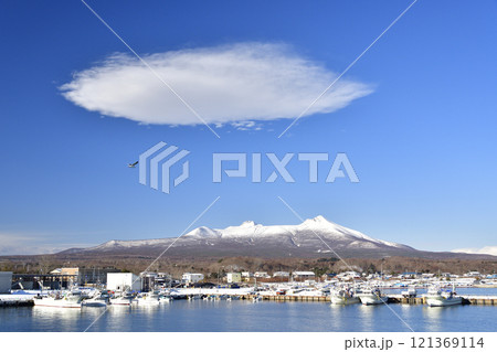 冬の北海道鹿部町本別港で雪の駒ヶ岳と雲の風景を撮影