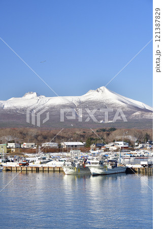 冬の北海道鹿部町本別漁港で雪の砂原岳と駒ヶ岳の風景を撮影