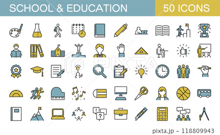 Education web icons set in duotone flat design. Pack pictograms with school bus, bell, board stand, pencil, geography, chemistry, microscope, medal, pen, study, schoolbag, other. Vector illustration.