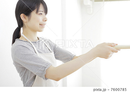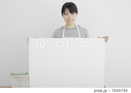 笑顔で本を持っているエプロンを着用した女性-ガッシュ
