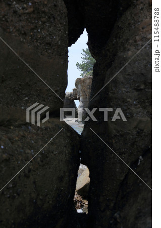 山陽小野田市の本山岬公園の「くぐり岩」を手前のくぐり岩予備軍の隙間から見る