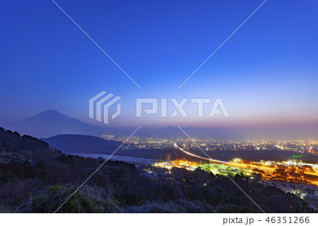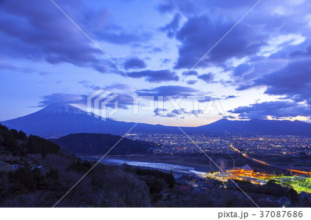夜明けの富士山と富士市街地、静岡県富士市にて
