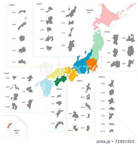 シンプルな日本地図 カラフル 都道府県で色分け 都道府県ごとに切り分け可能