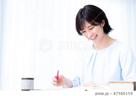 リビングで勉強する若い女性