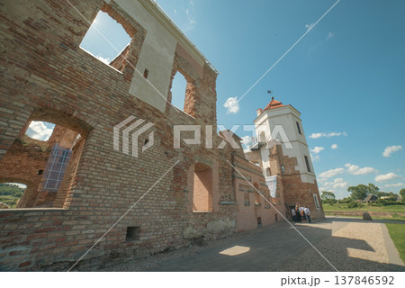 Ruins of Halshany Castle with restored white tower and copy space
