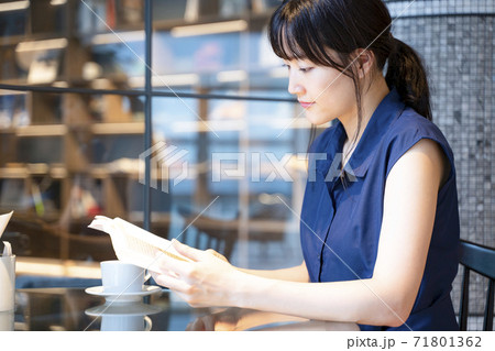 カフェで読書する女性
