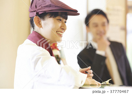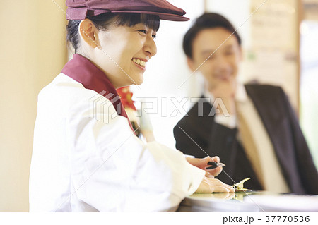 飲食店オフィスの入り口でOKサインを出す男性スタッフ