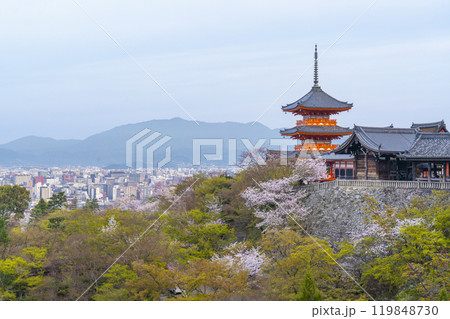 満開の桜と清水寺 三重塔と清水の舞台