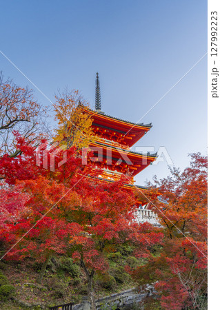 紅葉に包まれた秋の清水寺の三重塔 リフレクション