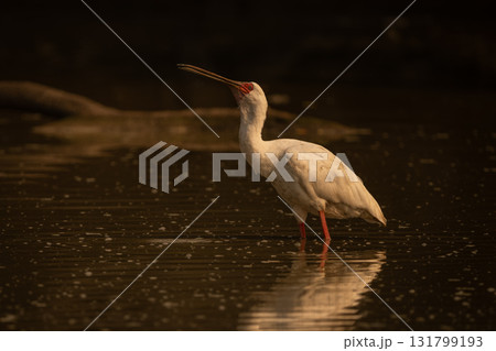 African spoonbill in calm pond lifts beak