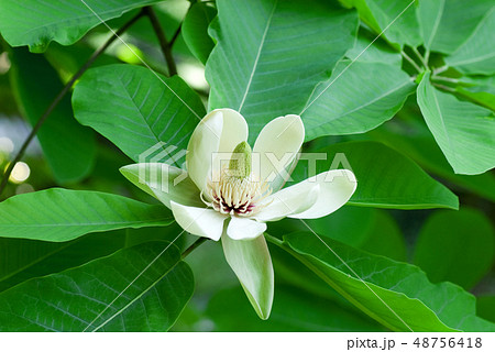 初夏の樹花・雌蕊が赤いホオノキの花・横位置