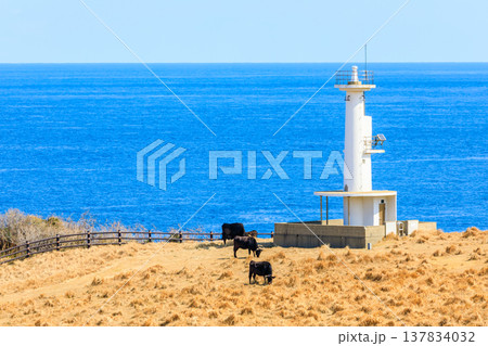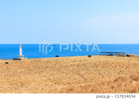 玄界灘に突き出した杉ノ原放牧場に広がる草原と肥前立石埼灯台(佐賀県唐津市呼子町)