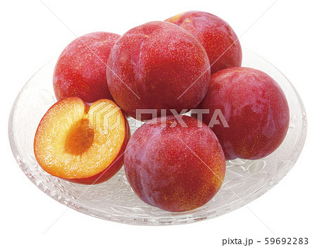 ガラス皿に盛り付けたスモモ (大石早生)
