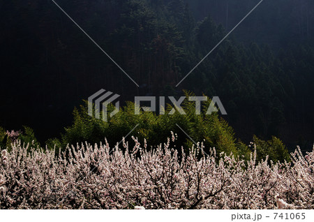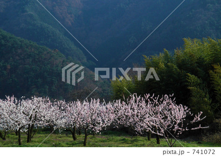 山肌と竹林と満開の杏の木