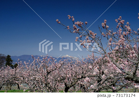 あんずの花と青空にうかぶ北アルプスの素晴らし絶景をご覧あれ。