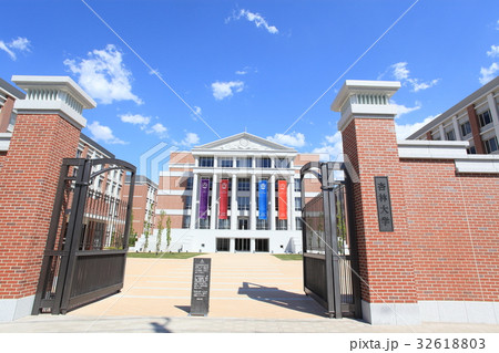 杏林大学 正面の立派な建物 夏晴れの青空 東京都三鷹市