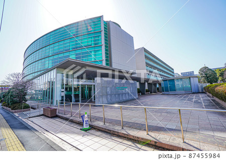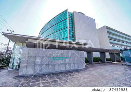 杏林大学のオシャレな校舎 夏晴れの青空 東京都三鷹市