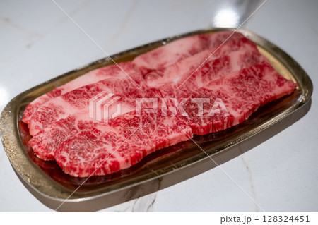 Raw Sliced Hanwoo Beef, marbled Korean Style Meat prepared on the golden plate