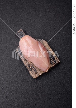 Pieces of raw chicken or turkey fillet with salt, spices and herbs