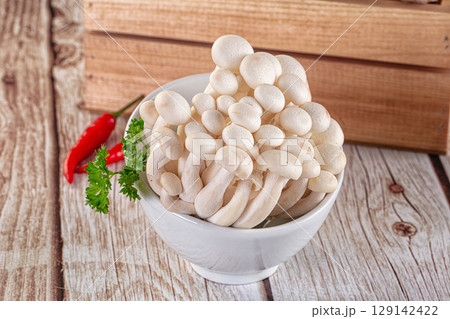 Fresh brown Shimeji mushroom in wooden bowl on white background