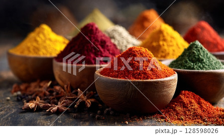 A vibrant assortment of colorful spices in wooden bowls, ideal for cooking and culinary concepts.