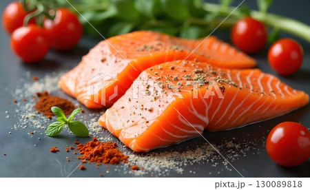 Three fresh salmon fillets with vibrant raspberries, kale, mushrooms, and nuts on blue