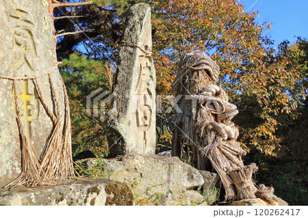 しめ縄で作られた顔のような道祖神