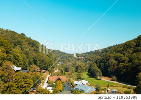 Ojcowskij park. Panoramic view to houses forest valley and forested mountains, flowered meadow just to the top of the hill special light