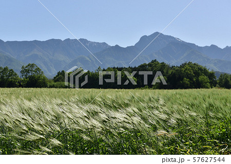 北杜市長坂町、風に靡き光り輝く麦の穂(バックは南アルプス甲斐駒ヶ岳)