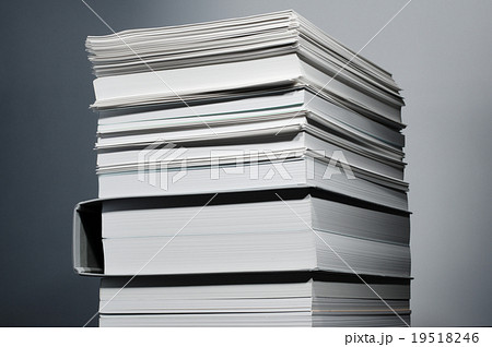 膨大な資料、データの蓄積。積み上げられた資料、ファイル、フォルダー。