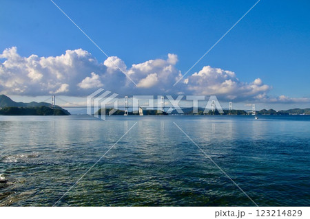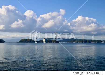 今治港沖から眺める来島海峡大橋(愛媛県今治市)