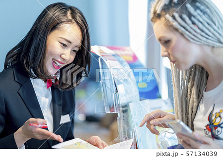 インバウンド需要に追われる外国人向け観光案内所の若い女性スタッフ