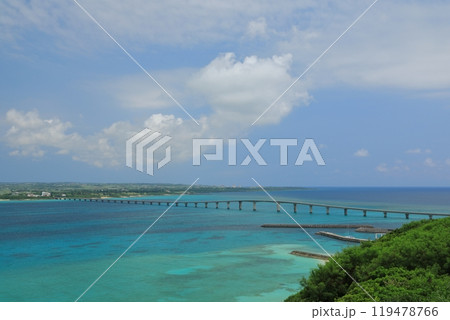 美しい海に架かる来間大橋を来間島竜宮城展望台から望む絶景