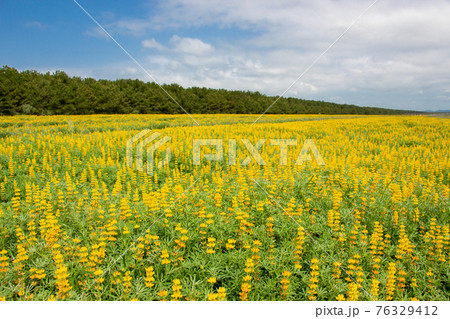 鹿児島県東串良町の柏原海岸のルーピン畑 満開の黄色いルピナス