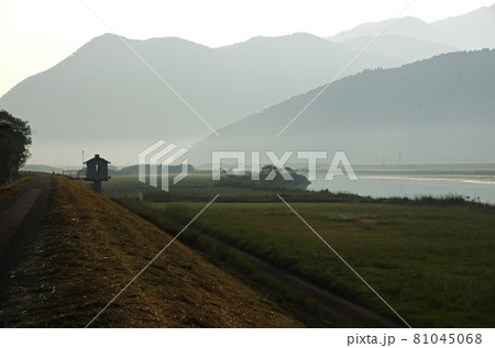 早朝の静寂な肝属川沿いの田園風景