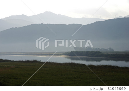 早朝の静寂な肝属川付近の山並みの風景
