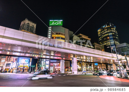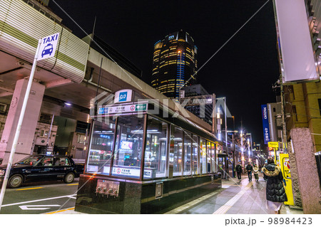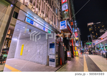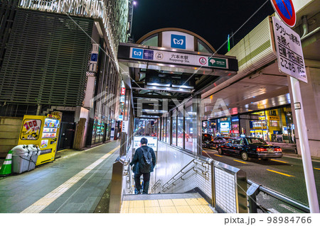 日本の東京都市景観 六本木の夜。六本木駅出入口