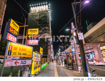 日本の東京都市景観 六本木の夜。六本木駅出入口4bや奥に六本木ヒルズ