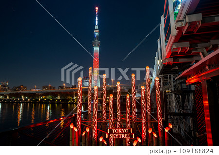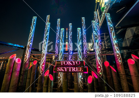 「東京都」ライトアップしたスカイツリーを望む