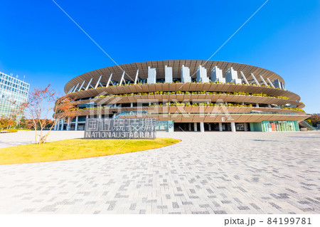 新国立競技場 国立競技場 風景 日本 東京 オリンピック スタジアム 快晴 青空 アップ 完成 竣工